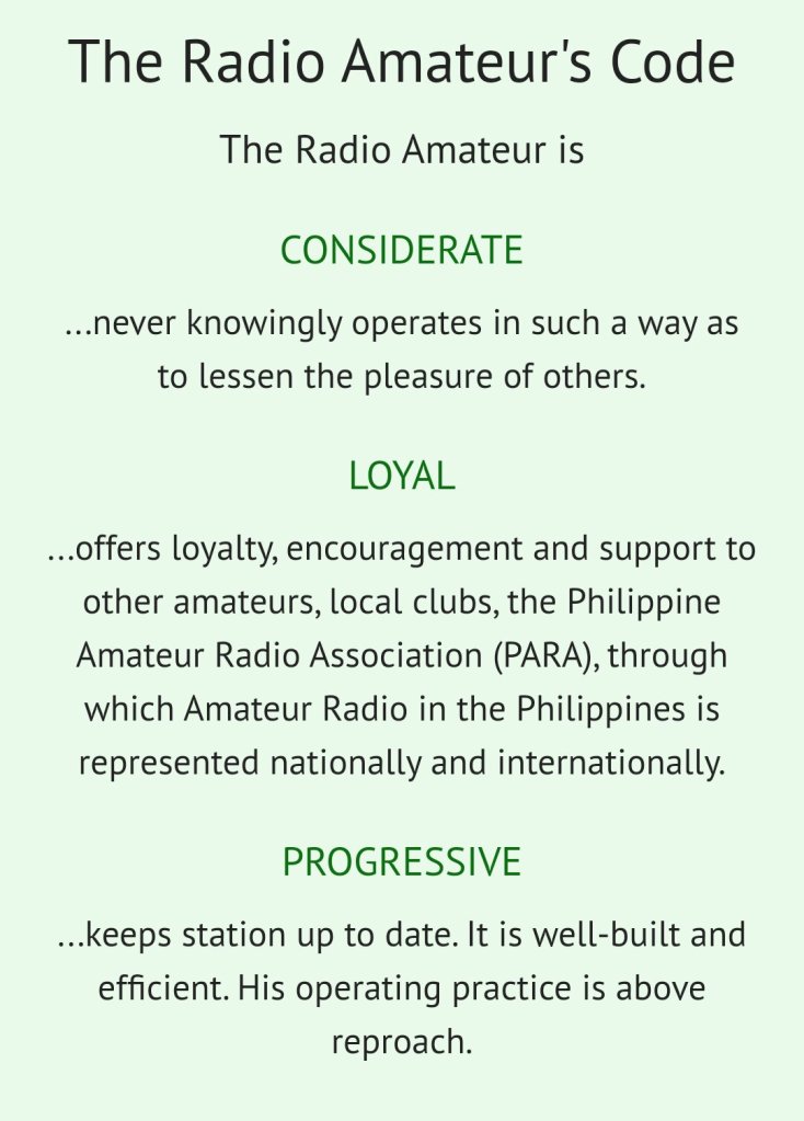 The Radio Amateur Is: CONSIDERATE never knowingly operating in such a way as to lessen the pleasure of others. LOYAL offering loyalty, encouragement and support to other amateurs, local clubs and the Philippine Amateur Radio Association, through which Amateur Radio in the Philippines is represented nationally and internationally. PROGRESSIVE with knowledge abreast of science, aContinue reading “The Amateur’s Code” - Philippine Amateur Radio Callsigns