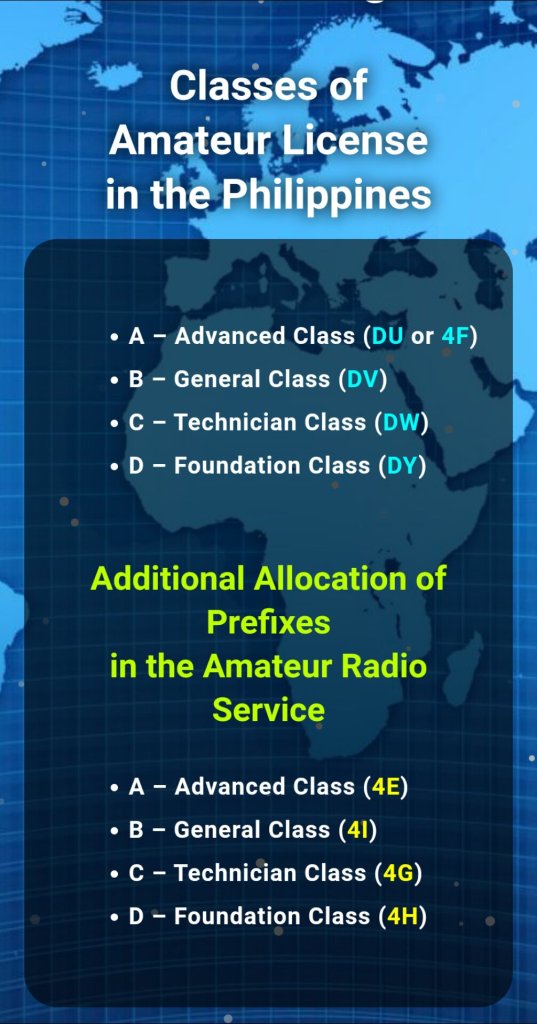 Callsign of Amateur License in the Philippines. DX1PAR DX- prefix, 1 – amateur district/region, PAR – suffix The standard format for Philippine callsigns is 2×3 – where 2 stands for the prefix letters (4D-4I or DU-DZ), and 3 stands for the suffix letters, both of which are assigned and regulated by the National Telecommunications Commission.Continue reading “Philippine Amateur Radio Callsigns” - Philippines Amateur Radio District